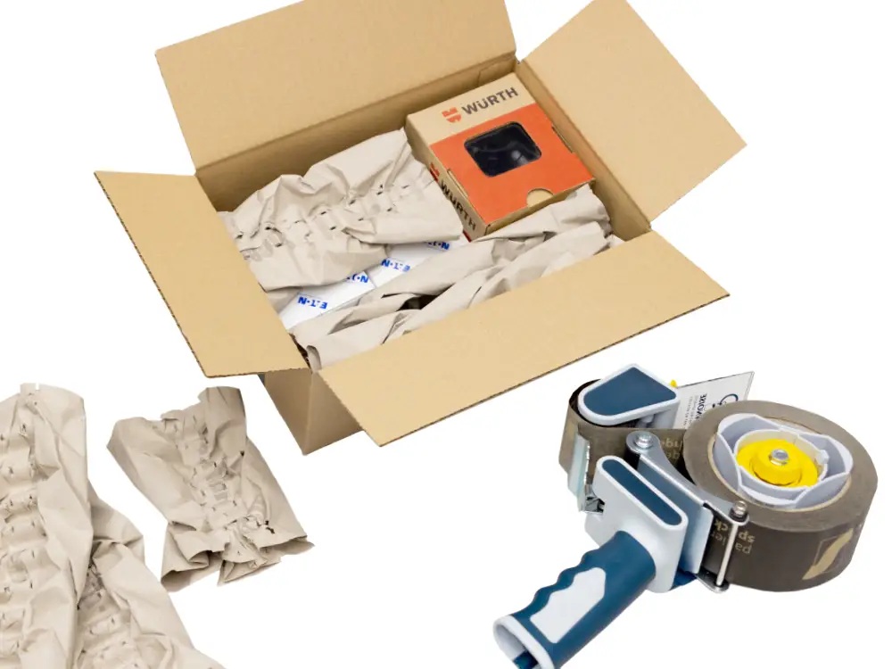 Papierpolster direkt am Packplatz produzieren und zum Fixieren und Auspolstern einsetzen.