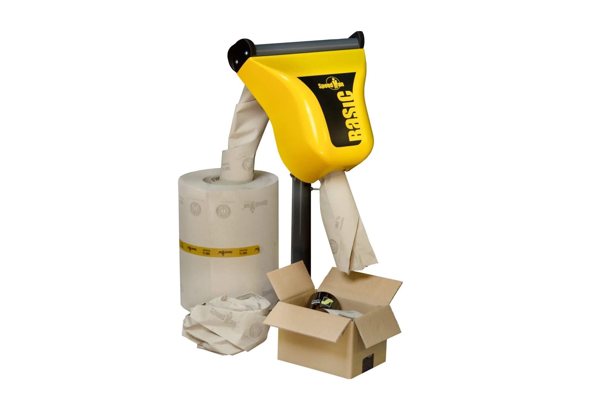 Der SpeedMan Basic ist ein kompaktes, elektrisches Papierfüllsystem für schnelleres Arbeiten am Packplatz. Die Bedienung erfolgt einfach über einen Fußschalter – so lässt sich Füllpapier schnell und gleichmäßig direkt in den Karton ausgeben. Durch die platzsparende Bauweise kann das System auch bei wenig Stellfläche sinnvoll integriert werden.