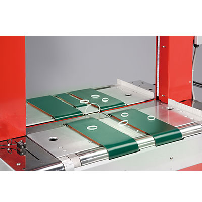 Presse / Niederhalter als Variante JU 100 TBH P (entspricht TP-702BPH): für zusätzliche Fixierung des Packstücks im Durchlauf – Druckluft erforderlich (Betriebsdruck 6 bar).